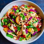 Przepis pochodzi z mojej ulubionej książki kucharskiej "101 łatwych przepisów azjatyckich" wydawnictwa Lucky Peach. Zmieniłam trochę składniki – nie dodawałam czerwonej kapusty, za to dodałam sałatę rzymską i trochę świeżego szpinaku. Byleby na końcu było te 10 szklanek zielonego. Dorzuciłam cieniutko pokrojoną paprykę, myślałam też nad tartą marchewką, ale nie chciało mi się trzeć. Wniosek – nie trzeba się sztywno trzymać proporcji i składników.