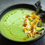 Chłodnik ogórkowy z salsą kukurydziano, awokado, brzoskwiniową