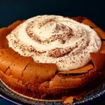 Przed podaniem oddzielamy nożem brzegi formy od ciasta, przenosimy ciasto na duży talerz, wypełniamy krater ubitą śmietaną, posypujemy delikatnie kakaem lub/i wiórkami z czekolady.