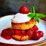Na talerzu układamy dolną część ciasteczka, na nią kładziemy część truskawek z sokiem, przykrywamy górną warstwą ciastka, kolejnymi truskawkami, a na wierzch kładziemy bitą śmietanę.
