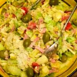 W dużej misce mieszamy sałatę, pomidory, sery, szynkę i oliwki.