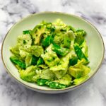 Sałatkę tę wypatrzyłam w Repertoire J. Batillany, jednej z moich ulubionych książek kucharskich. Wołała moje imię od dawna, ale w końcu przebrała się miarka i powiedziałam basta! wszelkim pastom i sosom serowym…Tym bardziej, że ta sałatka jest pyszna, lekka, chrupiąca, można zjeść jej górę bez najmniejszych wyrzutów sumienia. Czas więc na wiosenny powiew zielonego, i to bez żartów – już chyba bardziej zielono być nie może;-)