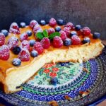 Ściągamy sernik z tortownicy na talerz, posypujemy cukrem pudrem i owocami, i serwujemy.