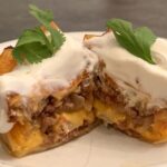 W zależności od wielkości tortilli wycinamy kwadraty pasujące do używanych foremek. Powinny wypełniać je do połowy.
