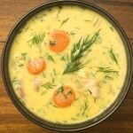 Dodajemy pokrojone mięso z kurczaka, solimy i pieprzymy do smaku, możemy też dodać soku z cytryny, jeśli lubimy kwaśne. Na koniec dodajemy koperek.